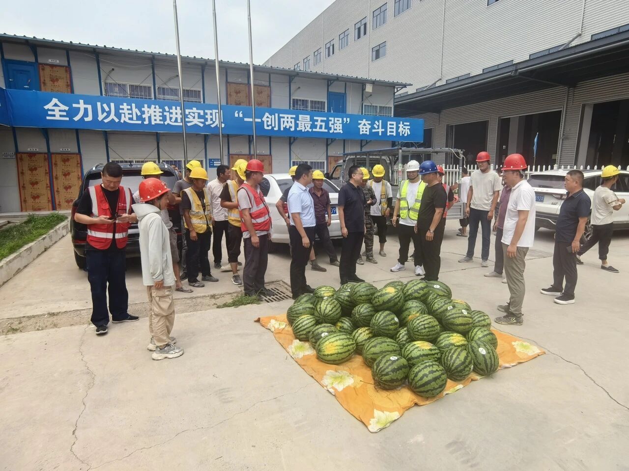 7月8日上午,市場投資公司副總經(jīng)理張航旗、總經(jīng)理助理胡占濤一行前往騰達(dá)項目施工現(xiàn)場,慰問酷暑作業(yè)中的一線工人并開展項目查看工作,為他們送去西瓜等清涼物資,并就項目建設(shè)問題進(jìn)行了交流。